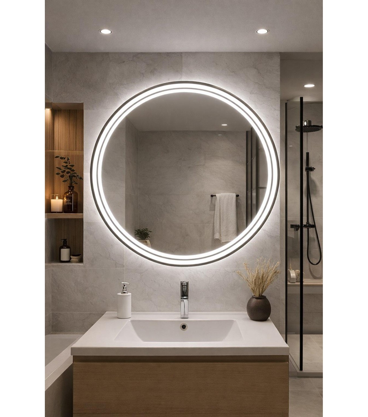 Okrągłe lustro LED o średnicy 110 cm to elegancki i nowoczesny element wyposażenia wnętrz. Bezramkowa forma z profesjonalnie szlifowanymi i polerowanymi krawędziami nadaje mu minimalistyczny wygląd, który doskonale sprawdzi się w łazience, pokoju, salonie lub studio