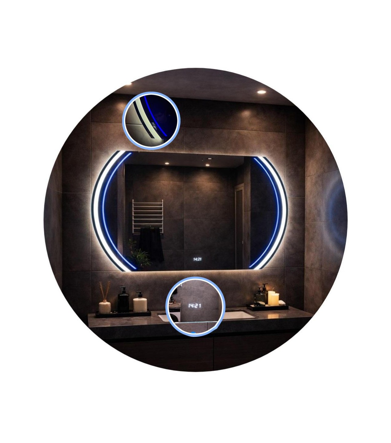 Nowoczesne lustro okrągłe Aura Blue LED 70 cm to połączenie innowacyjnej technologii, wyjątkowego designu i maksymalnej wygody użytkowania. Niebieskie podświetlenie LED w połączeniu z barwą neutralną tworzy hipnotyzujący efekt wizualny, który nadaje wnętrzu nowoczesny, luksusowy charakter.